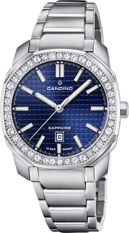 Циферблат синего цвета с геометрическим паттерном, накладные индексы, часовая и минутная стрелки с люминесцентным составом, апертура даты на «6 часах». Прочное сапфировое стекло. Восьмиугольный безель декорирован 46 цирконами. 35-мм корпус, интегрированный браслет из нержавеющей сатинированной стали.